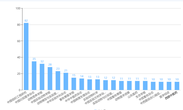 就文献发表杂志分布情况而言,发表动物模型相关文献最多的杂志包括中国组织工程研究杂志、中国比较医学杂志、动物营养学报、中国实验动物学报等(图5)。