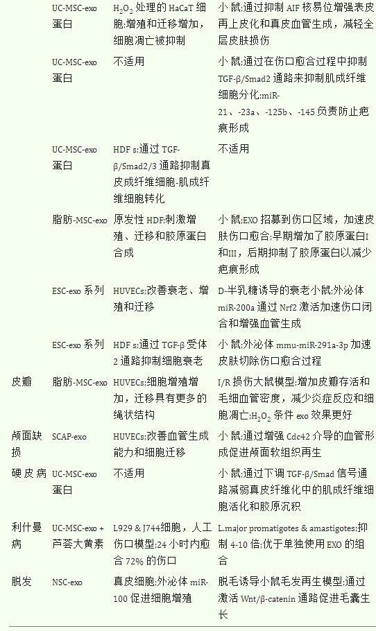 除了伤口愈合外,其他与整形外科相关的疾病已被证明是 SC-exo 治疗的合适靶点(表1)。这些包括但不限于:1、皮肤移植,如皮瓣;2、组织缺失,如颅面缺损;3、自身免疫性皮肤病,如硬皮病;4、皮肤感染,如利什曼病;5、毛发移植,如用于脱发;6、皮肤老化。